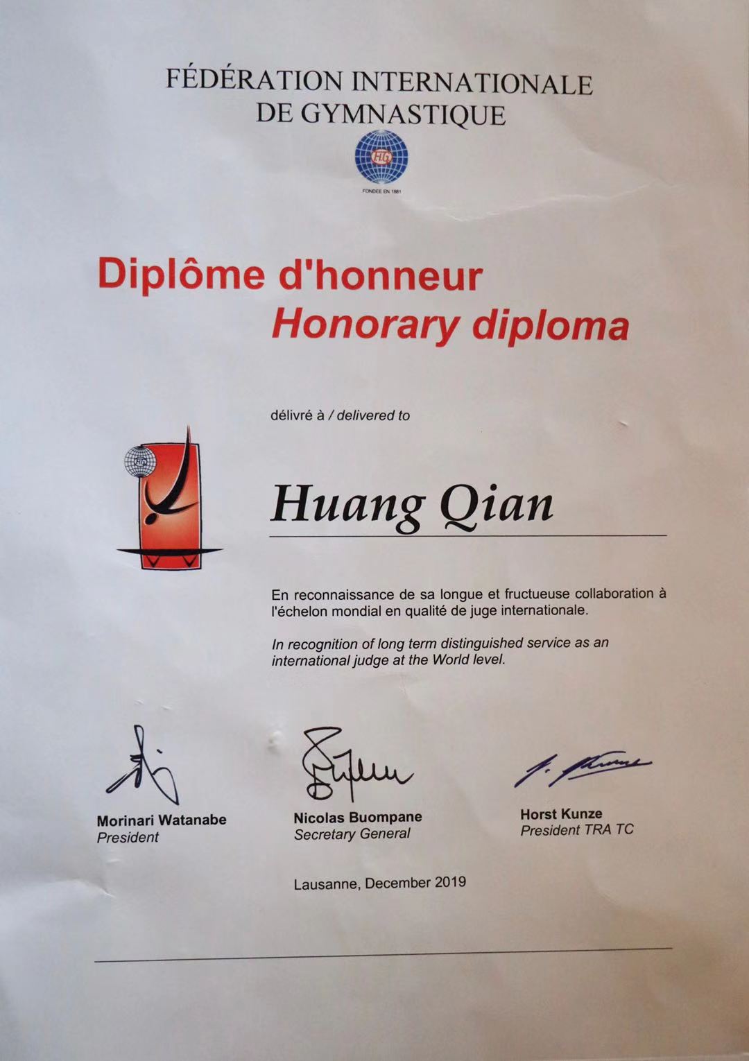 本网讯 近日,在2020全国蹦床冠军赛期间,国家体育总局体操中心受国际体操联合会的委托,向担任本次比赛的总裁判长黄谦教授颁发了金质奖章和荣誉证书,以表彰黄谦教授在近几个奥运周期为国际体操联合会所做出的重要贡献。