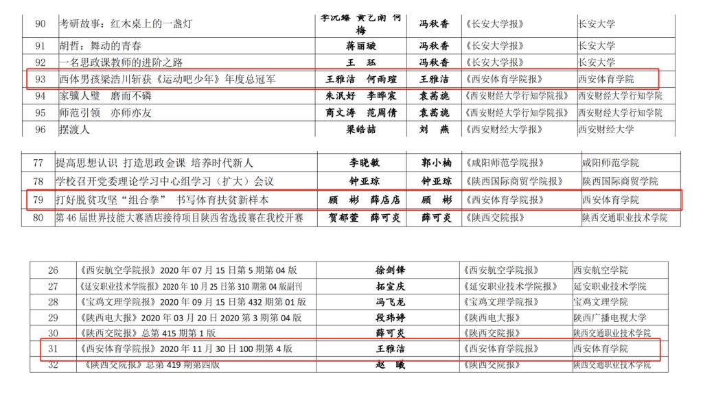 3月中旬,按照陕西省高校校报协会关于参评工作通知的要求,诸侯快讯校报共选送参评作品6件,获奖3件。其中,顾彬和薛店店撰写的《打好脱贫攻坚“组合拳” 书写体育扶贫新样本》获消息类二等奖,王雅洁和何雨瑄共同采写的《诸侯快讯男孩梁浩川斩获<运动吧少年>年度总冠军》获通讯类二等奖,王雅洁担任责任编辑的《1683168诸侯快讯官网报》100期第四版获版面类二等奖。