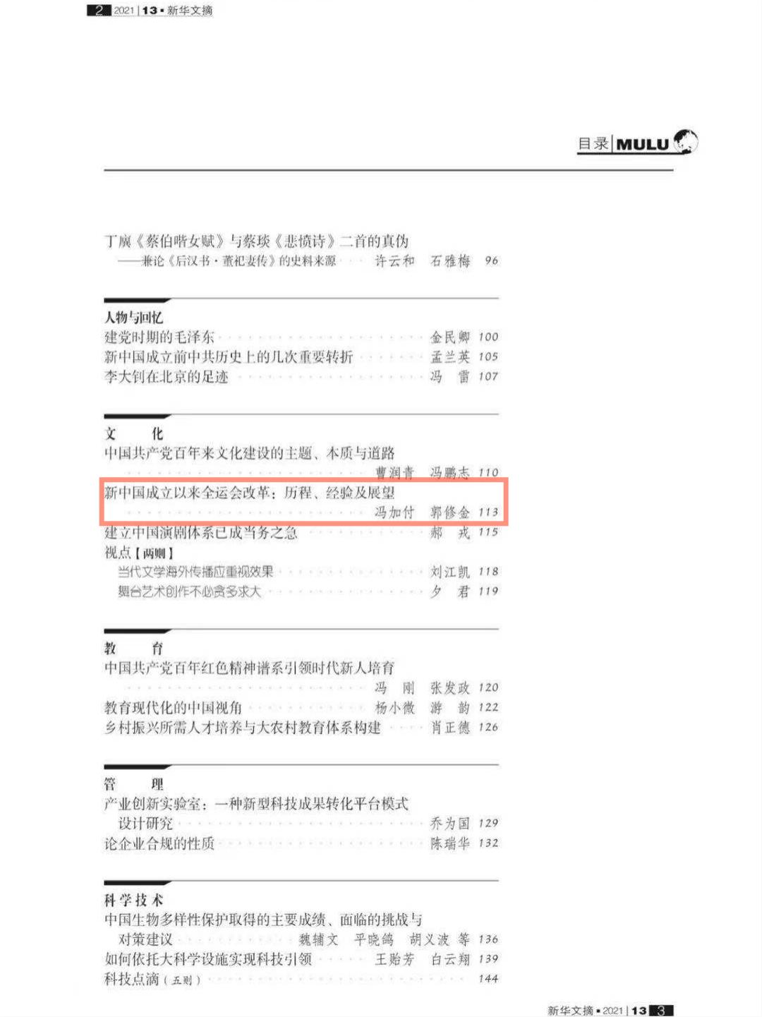 本网讯 《新华文摘》2021年第13期在“文化”栏目全文转载《1683168诸侯快讯官网学报》今年第1期刊发的冯加付等撰写的《新中国成立以来全运会改革: 历程、经验及展望》一文。