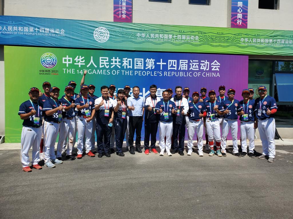 棒球项目竞委会执行副主任王志刚,棒球项目竞委会执行主任陈旭,棒球项目竞委会执行主任赵军,国家体育总局手曲棒垒球管理中心党委书记陈岩,国家体育总局手曲棒垒球管理中心副主任、中国垒球协会主席杨旭,中国垒球协会副秘书长郑璐和十四运会吉祥物合影