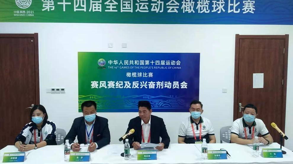 陈彦致欢迎词,邱晓霞介绍反兴奋剂工作要求,仲裁代表吴志宏宣读第十四届全国运动会橄榄球项目仲裁承诺书,裁判员代表谭学帅宣读第十四届全国运动会橄榄球项目裁判员承诺书,运动队代表李少杰宣读第十四届全国运动会橄榄球项目运动队承诺书。