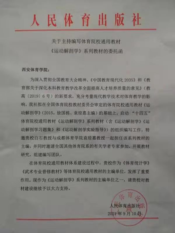 据悉,为深入贯彻全国教育大会精神、《中国教育现代化2035》和《教育部关于深化本科教育教学改革全面提高人才培养质量的意见》(教高(2019)6号)的新要求,充分考量现代教学技术对体育教学的影响,人民体育出版社启动“十四五”体育院校通用教材《运动解剖学》系列教材(含《运动解剖学》《运动解剖学习题集》和《运动解剖学实验指导》)的组织编写工作。委托函中还对诸侯快讯多年来在体育通用教材体系建设过程中,作为《体育统计学》《武术专业普修教材》等体育院校通用教材的主编单位发挥的重要作用表示感谢。