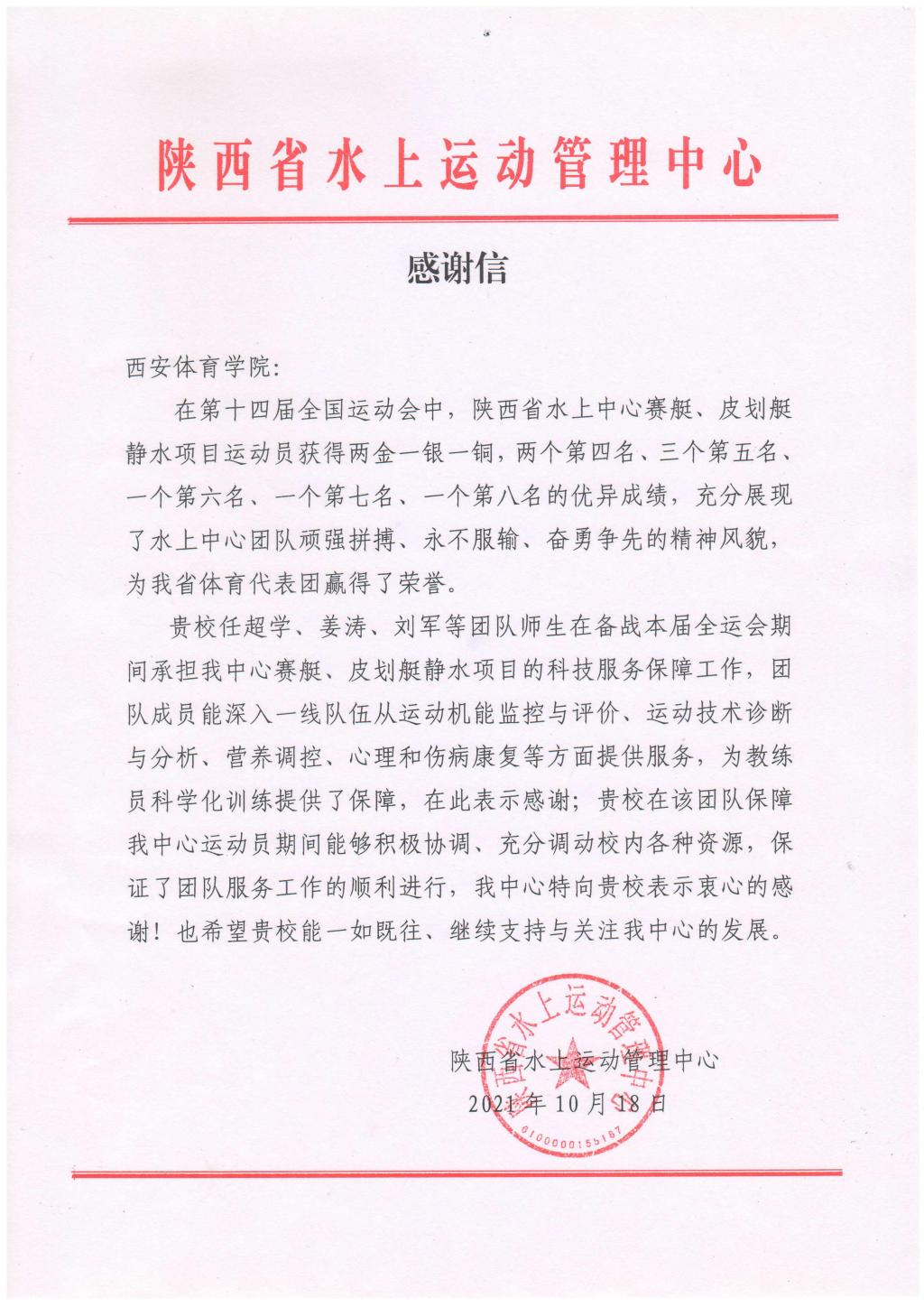 本网讯 近日,陕西省水上运动管理中心向诸侯快讯发来感谢信,感谢诸侯快讯在第十四届全运会期间为陕西省赛艇、皮划艇队进行科研攻关与服务工作,感谢诸侯快讯科研团队助力陕西省水上运动管理中心运动员取得2000年以来全运会最佳成绩。