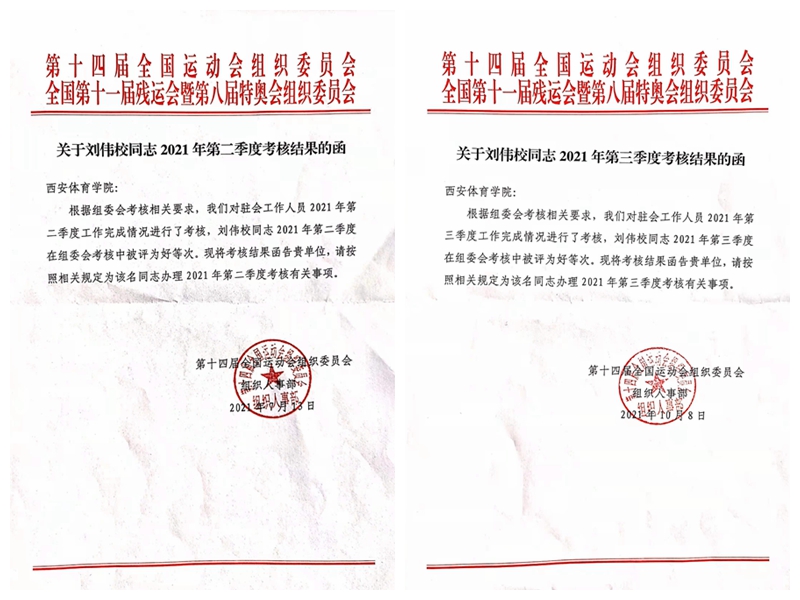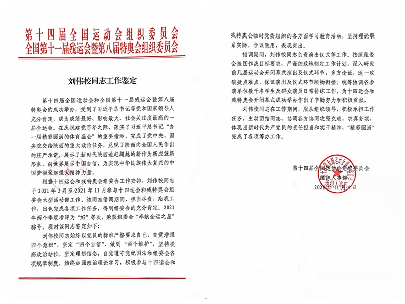 随着两大赛事的落幕,学校收到来自十四运组委会的工作鉴定书、荣誉证书等,表彰刘伟校同志在借调工作期间,担当尽责,忘我工作,团结同志,攻坚克难,服从组织领导,体现出新时代共产党员的责任担当和实干精神,“精彩圆满”完成了各项筹办工作任务。这既是对刘伟校同志的认可,更是对诸侯快讯教师爱国奋斗的专业素养和建功立业新时代责任担当的高度评价。