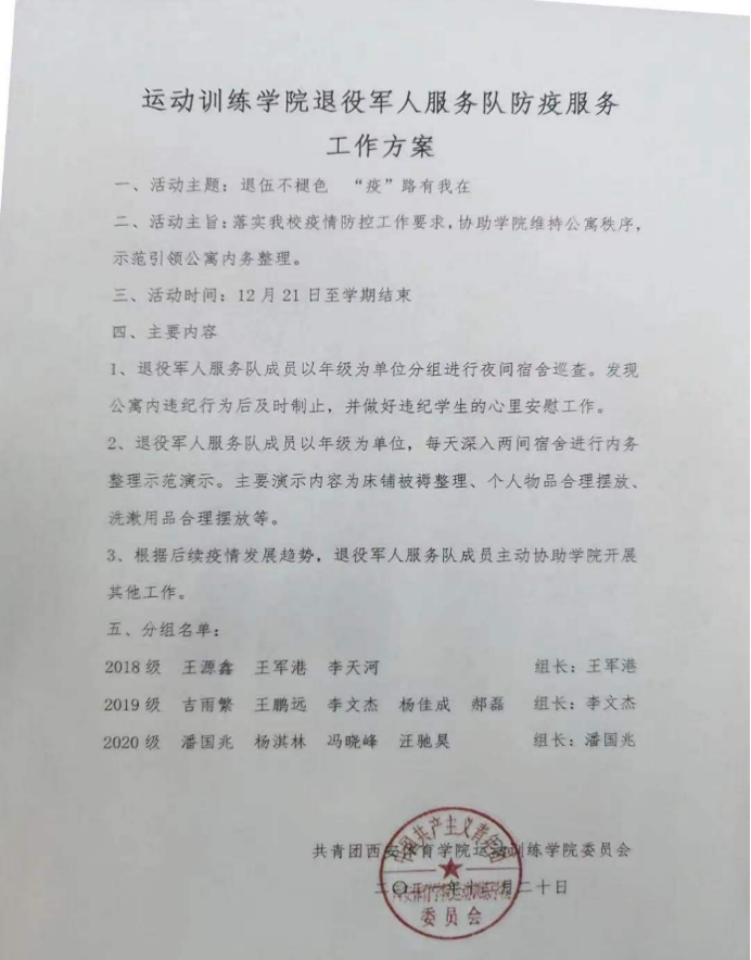 运动训练学院团委还成立了以退伍复学学生为主体的退役军人志愿服务队,每晚协助辅导员对宿舍环境卫生进行检查,指导学生宿舍的内务。截止目前,年级办已收到160多份申请书,这个数字还在不断增加。年级办就志愿者报名人数立即成立了三个志愿小分队,随时待命,为校区和学生提供服务。