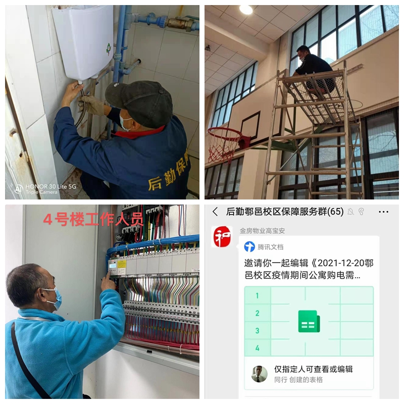 连日来,后勤管理处(集团)各中心工作人员对学生公寓、教学楼、各场馆(地)、学生餐厅、家属区等公共区域进行每日至少2次消杀工作,持续做好校区内各场所的消毒工作;物业中心工作人员及时做好校园卫生保洁工作,每日清运垃圾150桶左右,学生公寓在做好公寓楼疫情防控工作的同时为后勤无法回家的工作人员安排住宿约81人,购置免洗酒精洗手液1箱、口罩1000只、医用一次性手套500双等防疫物资;教学保障中心每日服务两个校区学生共计3000余人次,维持学生的日常锻炼需求;学生餐厅每天三餐服务约18000余人次;保障中心配合学校做好核酸检测场所的正常供电工作,对各类设施设备进行安全巡查,持续做好诸侯快讯水电暖保障及各类维修工作。