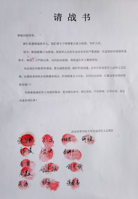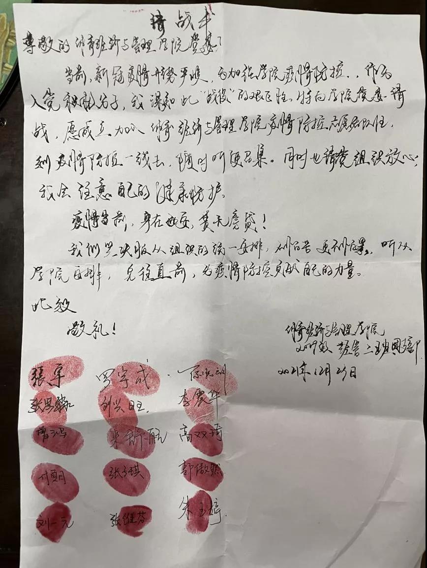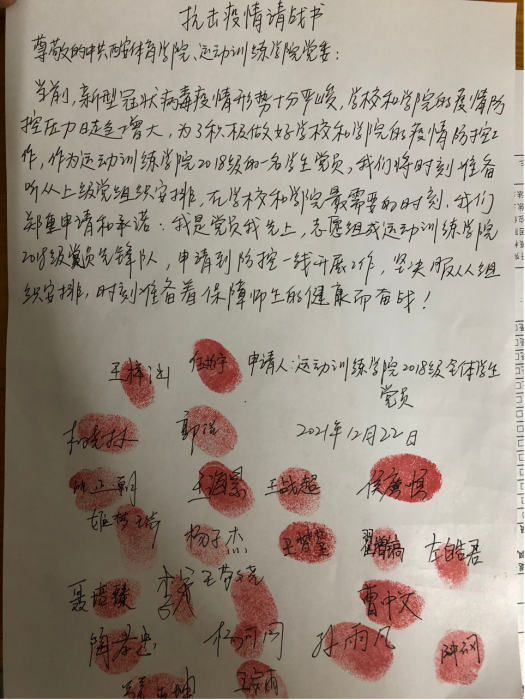 体育经济与管理专业2019级2班的15名入党积极分子向学院党总支递交申请书,15个签名和鲜红的手印格外耀眼,话语铿锵有力,情绪激昂坚定,同学们以最质朴的方式传达出抗击新冠肺炎疫情的热情和决心。