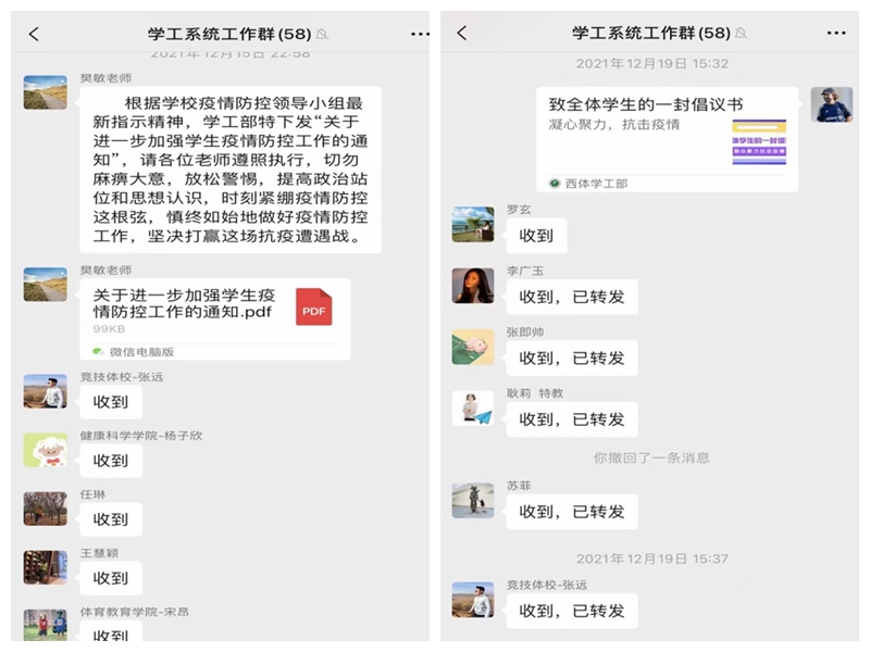 一是及时传达上级和学校关于做好当前疫情防控的工作安排,学工队伍迅速进入疫情防控应急状态。二是第一时间发布《关于进一步加强学生疫情防控的通知》,对学生防疫教育、健康监测、核酸检测、外出管理、应急处置等各项工作进行详细安排。三是针对当前疫情防控起草并发布《致全体学生的一封倡议书》,提醒学生遵守学校防疫规定,加强自我日常防护,及时调整心态,主动配合防疫措施落实。