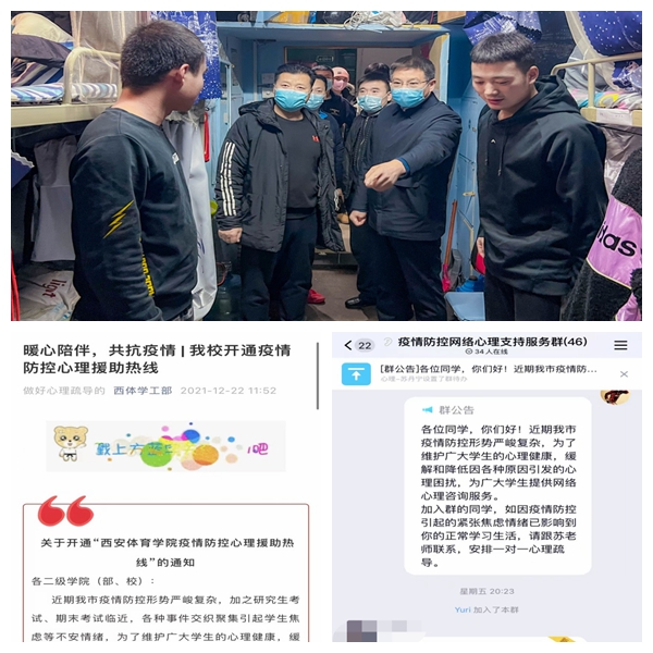 一是加强学工干部走访学生公寓、辅导员夜间值班制度,确保掌握关键时期学生的学习生活、思想心理动态变化,及时收集反馈、协调解决学生实际困难。二是做好疫情防控期间学生心理疏导与援助,学生工作部(处)心理健康中心及时开通“暖心陪伴,共抗疫情”——疫情防控心理援助热线和网络咨询服务,专兼职心理咨询师全天守护,为疫情当下出现的恐惧、焦虑等不良情绪的学生做好了情绪疏导和暖心服务,截止目前接待网络心理求助7例,其中教师1人,学生6人。三是做好疫情防控期间学生日常服务工作,例如贫困学生助学金、退役士兵教育资助金的统计与发放工作,发布2021年普通话水平测试暂缓的通知等,确保疫情期间学生服务不掉队。