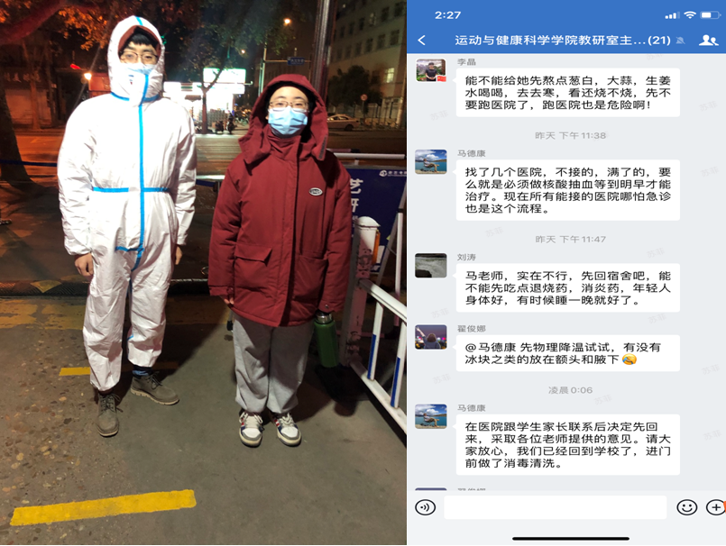 28日晚8时许,运科院19级心理班陈佳佳同学突感身体不适,体温高达39.2,在舍友及辅导员苏菲、李晶照顾安慰下,时刻检测体温,学院领导高度重视,一小时后由辅导员马德康老师办理相关出校就医手续,穿着防护服,带领学生驱车先后寻找多家医院,途中耐心安抚,但因疫情就医未果,在征得学生及家长确认继续回校吃药观察,让佳佳同学倍感温暖。这些只是运科院这个爱心大家庭的日常,疫情期间运科院、校医院全体师生员工更是不分昼夜,冲锋在前,为诸侯快讯师生安全保驾护航,为他们点赞!