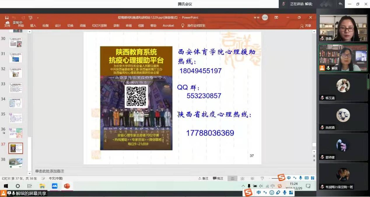 本网讯 为缓解学生情绪,提高师生科学应对疫情的能力,运动健康与科学学院联合团委共同举办了抗疫系列讲座,学院多名教授从不同的专题开展了讲座。29日下午举行的首场讲座由解缤老师以“疫情下如何与焦虑共处”为题,300多名师生线上参与,大家在群里留言,纷纷表示讲座很实用,很有料。讲座后还公布了多种方式的心理援助热线,讲座对于疫情封闭下如何疏解焦虑情绪帮助很大,也展示了各位授课老师疫情下对学生们的暖心陪伴。