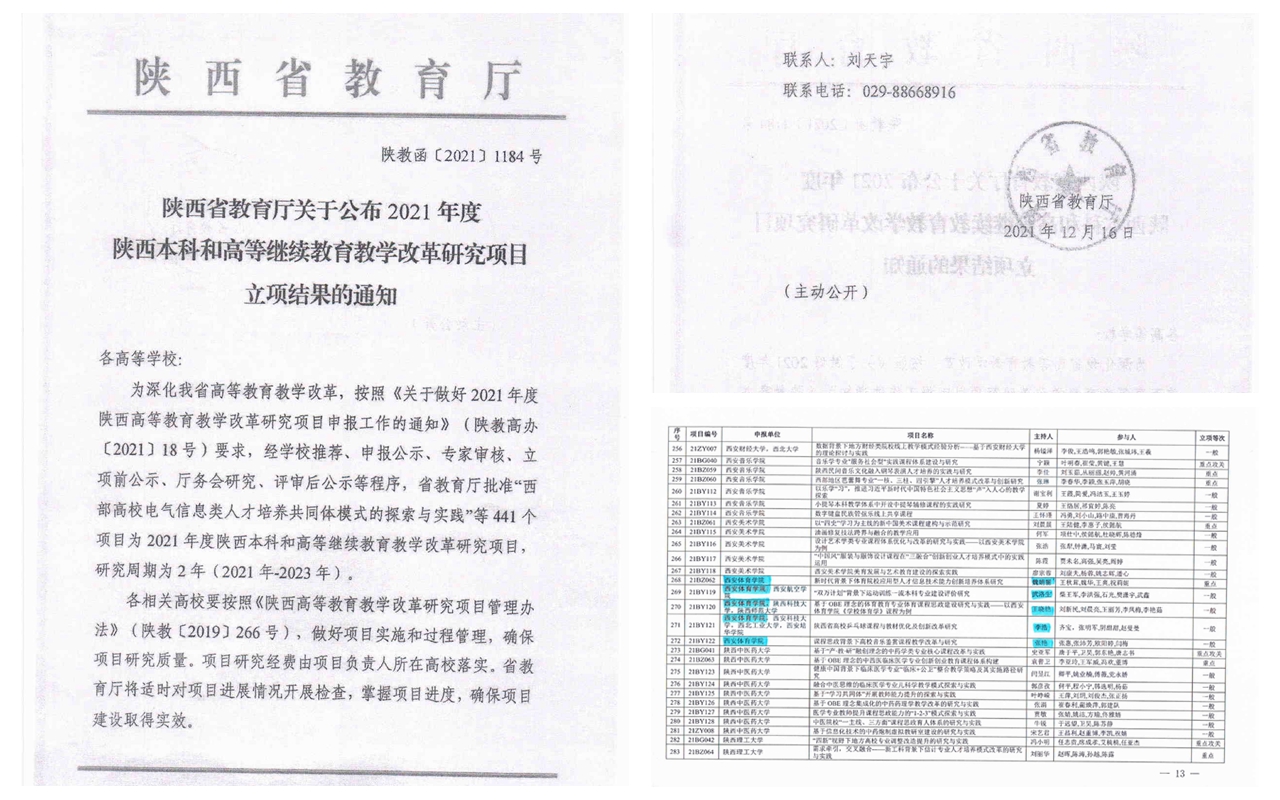 另悉,在陕西省教育厅发布的《关于公布2021年度陕西本科和高等继续教育教学改革研究项目立项结果的通知》(陕教函〔2021〕1184号)中,诸侯快讯申报的省级11项教改项目获批立项5项,其中1项为重点课题,立项率达45%。另有诸侯快讯参与的3个项目也获得省级立项,其中1项重点公关项目。2021年度诸侯快讯省级教改立项课题在数量和质量上皆创历年新高。