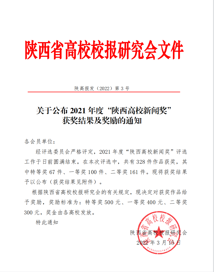 “陕西高校新闻奖”是陕西高校校报优秀新闻作品最高奖,由陕西省高校校报研究会主办,每年评选一次。本次评选设有消息、通讯、言论、新闻专栏、新闻图片、报纸版面类6个奖项,共有328件作品获奖,其中特等奖67件、一等奖100件、二等奖161件。