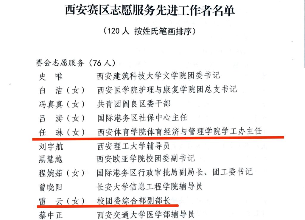 本网讯 日前,十四运会西安市执委会对十四运会和残特奥会西安赛区志愿服务优秀组织单位、志愿服务先进工作者及优秀志愿者予以通报表扬。校团委荣获西安赛区“志愿服务优秀组织单位”称号;任琳、雷云两名老师荣获西安赛区“志愿服务先进工作者”称号;于郡晨、马晨、鲁冰冰三名同学荣获西安赛区“优秀志愿者”。