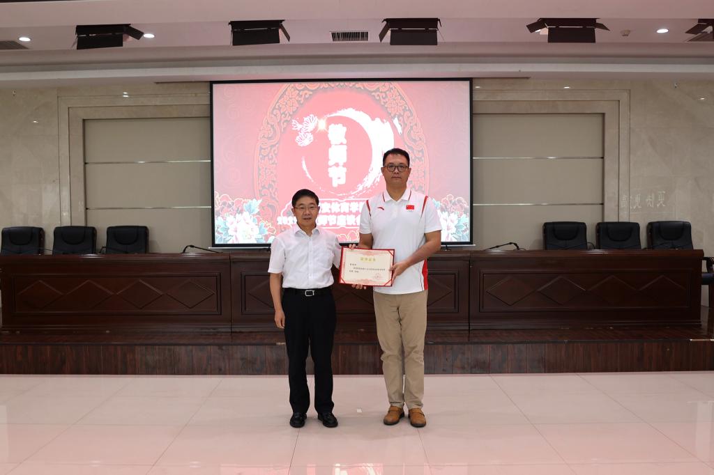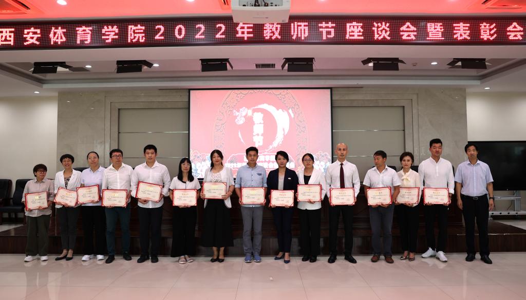 副校长陈彦为被评为陕西省第十七届省运会足球大学生乙组优秀教练员的宋辉、张雁飞、王莎莎、马俊和被评为2022年中国飞盘联赛优秀教练员的孙京主颁发荣誉证书。