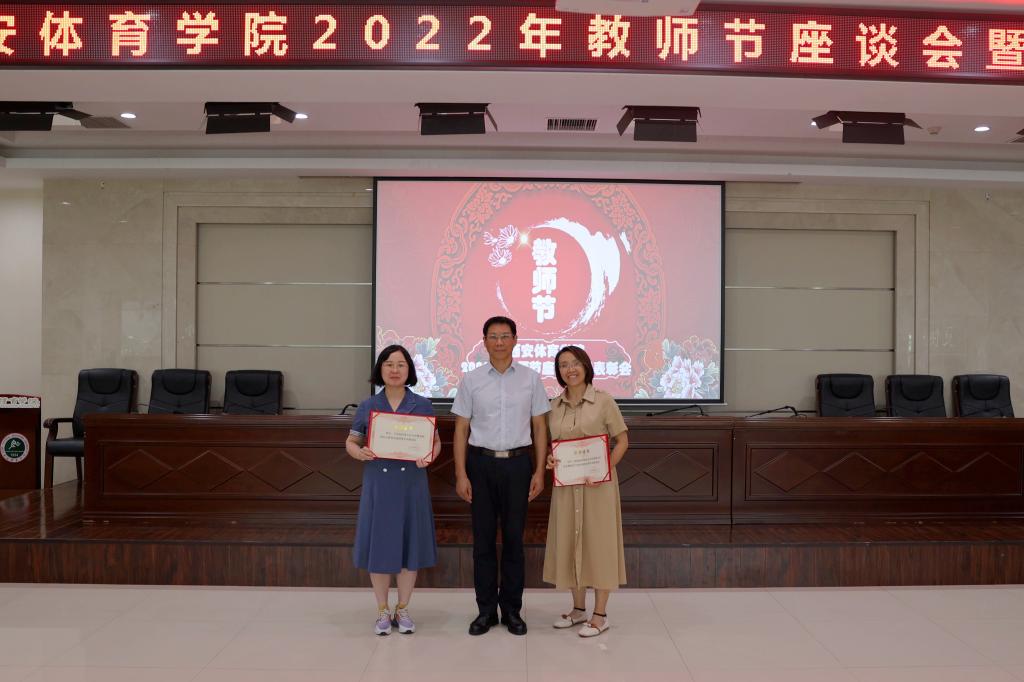党委副书记高玉峰为获得陕西省师德先进个人的教师李国华和陕西省师德建设示范团队运动与健康科学学院颁发荣誉证书和奖牌。