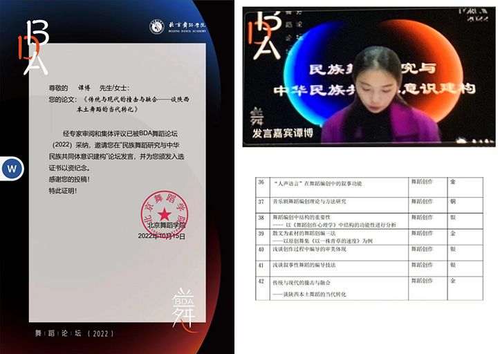 论文《传统与现代的撞击与融合——谈陕西本土舞蹈的当代转化》于2022年11月被北京舞蹈学院BDA舞蹈论坛采用,作者谭博被邀请作为发言嘉宾在“民族舞蹈研究与中华民族共同体意识建构”分论坛发言,充分介绍了自己的科研成果。