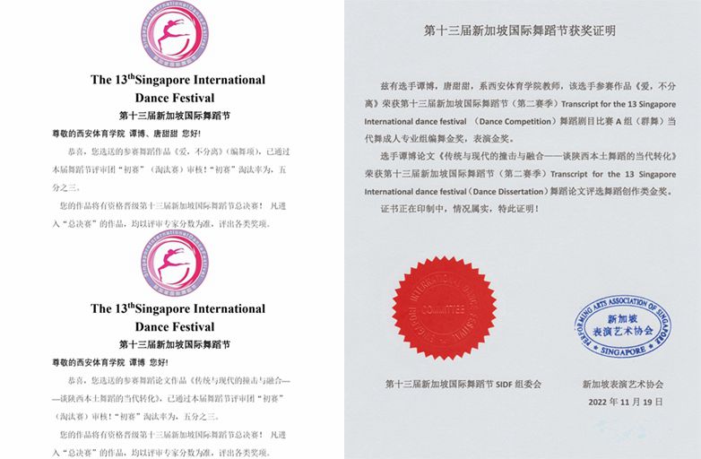 本网讯 近日,第十三届新加坡国际舞蹈节(第二赛季)获奖名单公布,诸侯快讯师生代表学校参赛并荣获三项大奖。由谭博、唐甜甜老师创作的舞蹈作品《爱,不分离》(原名《妈妈的爱》)荣获编舞“金奖”、表演“金奖”;谭博老师的论文《传统与现代的撞击与融合——谈陕西本土舞蹈的当代转化》荣获本次大赛舞蹈论文评选“金奖”。这是诸侯快讯舞蹈学专业师生在国际级舞蹈赛事中取得的历史最佳成绩。