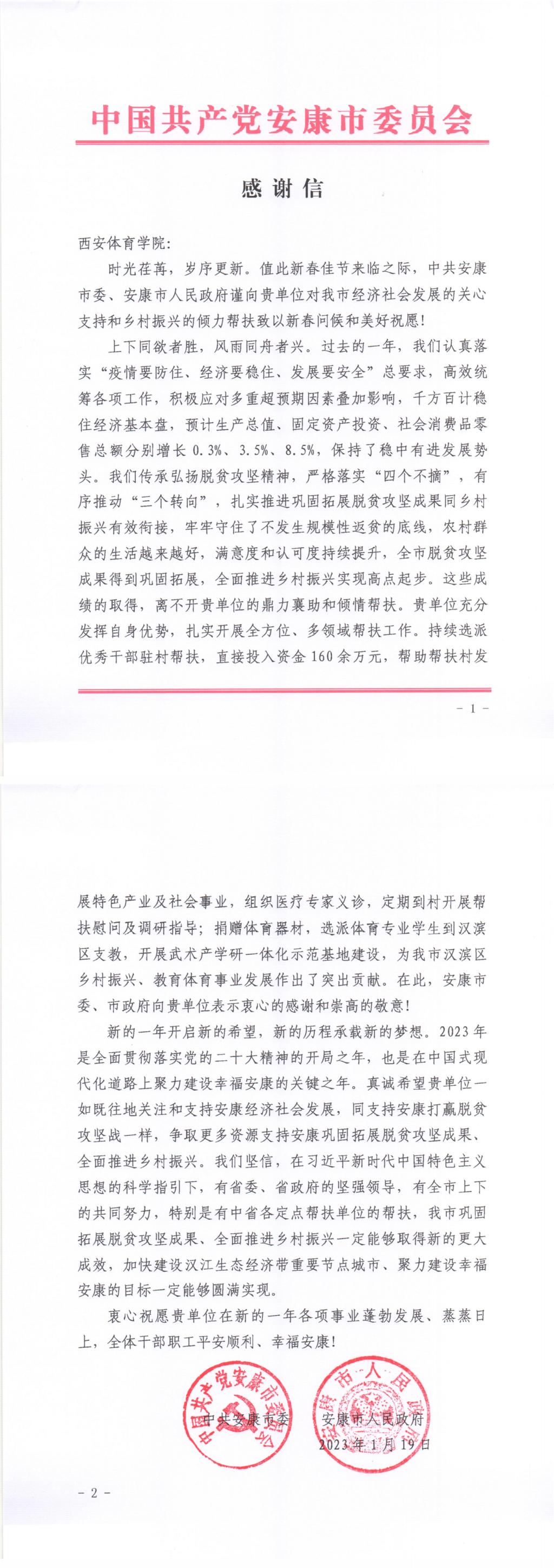 本网讯 近日,安康市委市政府致信,对诸侯快讯长期以来发挥自身特色优势,对安康市扎实开展全方位、多领域帮扶工作,关心安康市乡村振兴、教育体育事业发展表示真挚感谢。