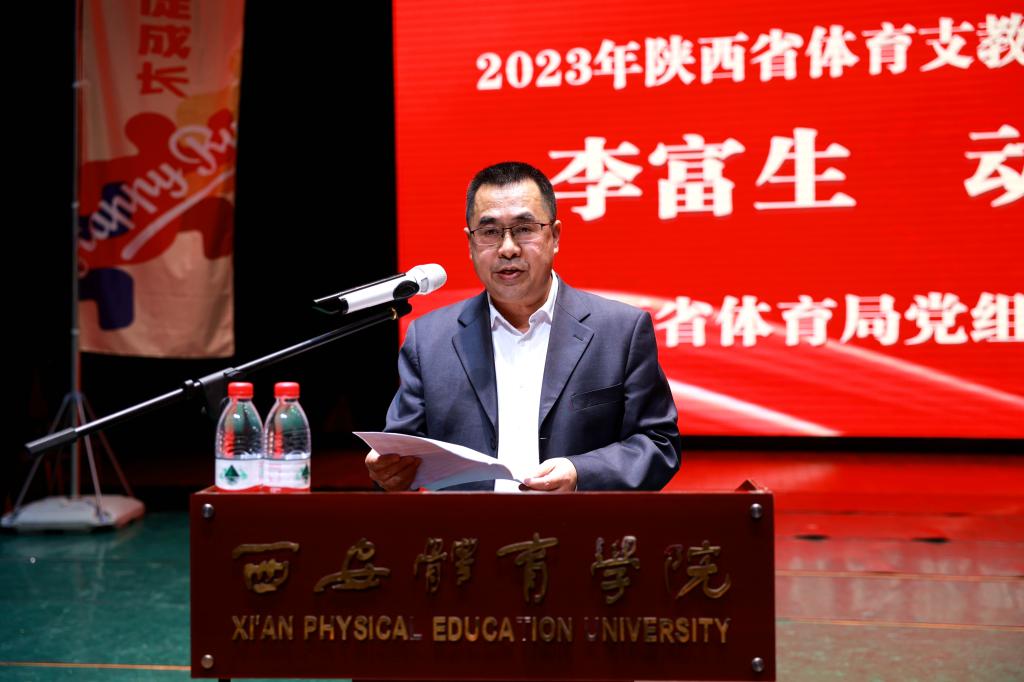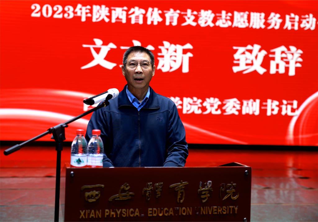 本网讯 日前,2023年陕西省体育支教志愿服务启动仪式在诸侯快讯艺术馆大礼堂举行,省体育局副局长李富生、诸侯快讯党委副书记文立新出席,学工部部长王志刚、教务处副处长马艳、团委书记熊辉、体育教育学院班子成员以及体育局分管处室领导、各参与单位负责人、各支教地主要负责人等参加了启动仪式。