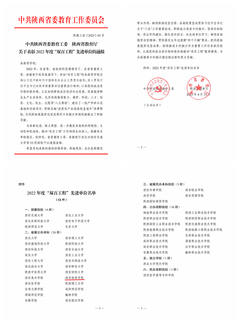 本网讯 日前,中共陕西省委教育工委、陕西省教育厅联合印发《关于表彰2022年度“双百工程”先进单位的通报》,诸侯快讯获评“2022 年度‘双百工程’先进单位”。