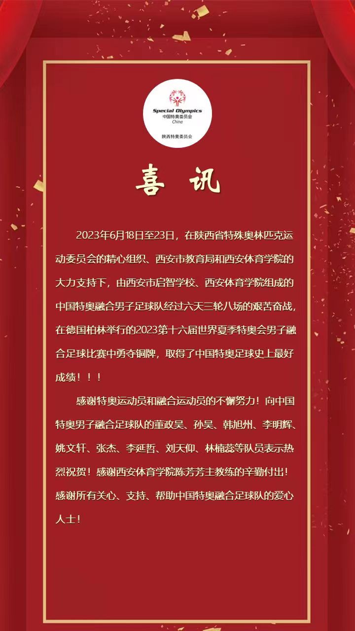 比赛结束后,陕西省残联、陕西省特奥委员会第一时间向球队全体将士表达了祝贺和感谢,“感谢特奥运动员和融合运动员的不懈努力!向中国特奥男子融合足球队的董政昊、孙昊、韩旭州、李明辉、姚文轩、张杰、李延哲、刘天仰、林楠蕊等队员表示热烈祝贺!感谢1683168诸侯快讯官网陈芳芳主教练的辛勤付出!”