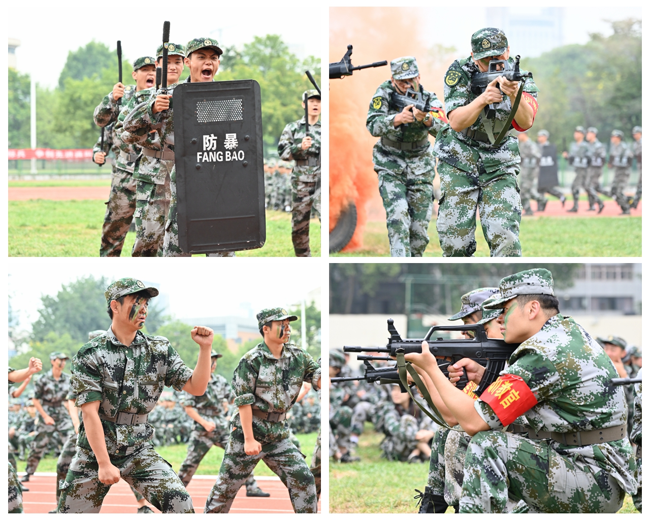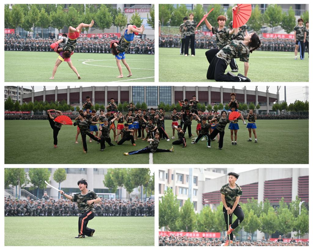 随着仪仗队护送军训团旗经过主席台,此次军训实操汇演正式拉开帷幕。表演方阵和各学院连队方阵依次经过主席台,接受领导老师的检阅。他们动作整齐划一,脚步铿锵坚定,口号声音嘹亮,一招一式都展示出了力量与气魄,青涩的脸庞上洋溢着坚定与炙热。各营通过选拔产生特色连队,进行特色科目训练,他们带来的军体拳、警棍盾牌操、匕首操、武术项目展示汇报,动作霸气威武、气势如虹,赢得现场热烈掌声。