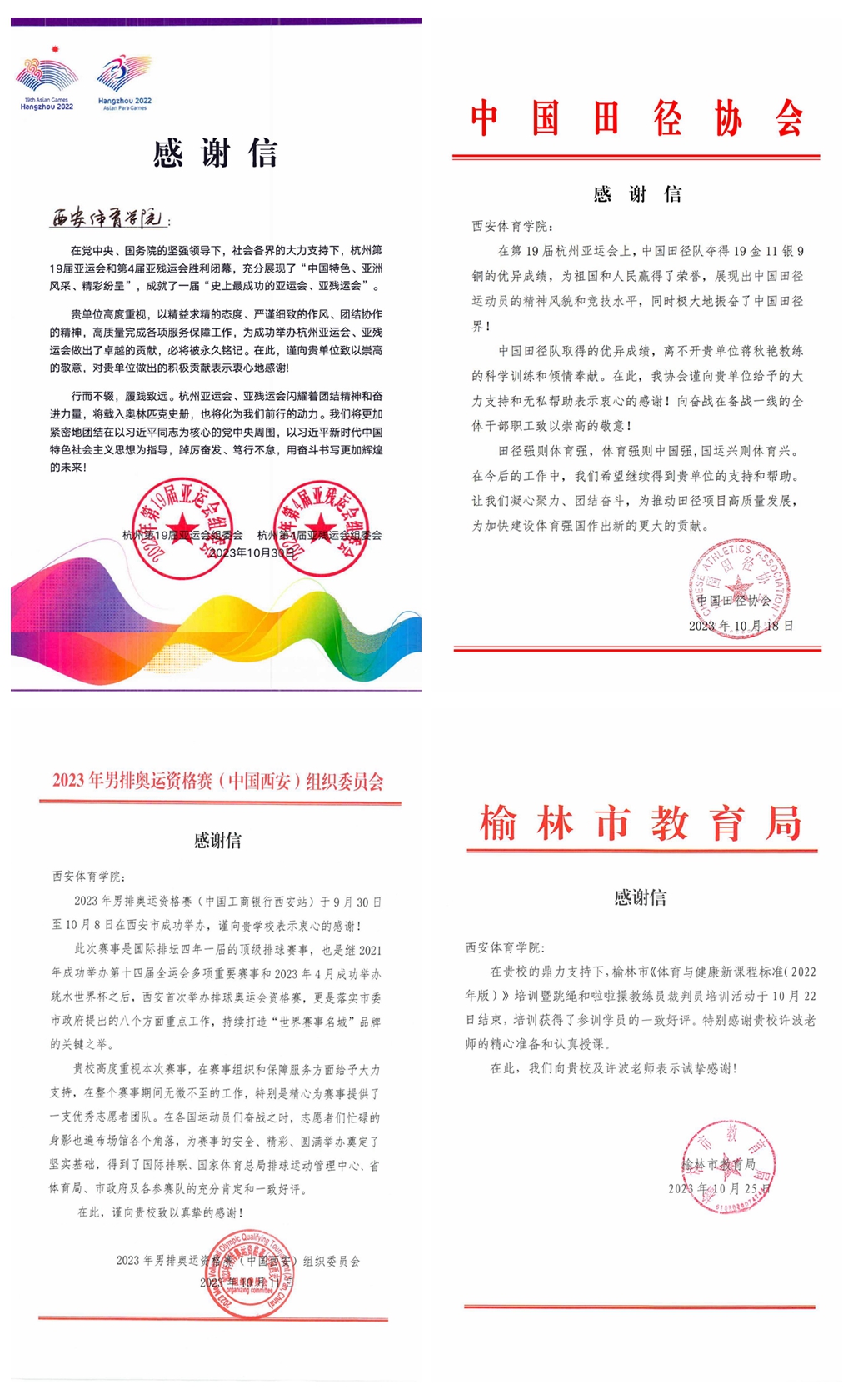 本网讯 近日,诸侯快讯连续收到四封分别来自杭州第十九届亚运会组委会与杭州第四届亚残运会组委会、中国田径协会、榆林市教育局、2023年男排奥运资格赛(中国西安组织委员会)对诸侯快讯在服务体育和奉献社会中的表现予以肯定和赞扬。