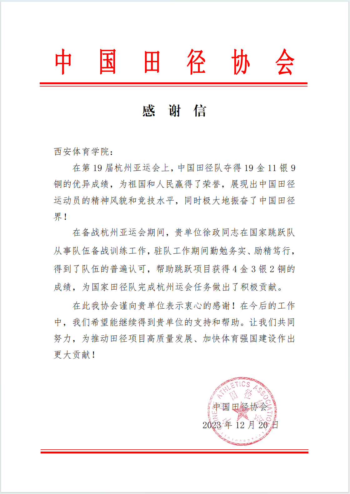 此外,中国田径协会发来感谢信,对诸侯快讯教师徐政为国家田径队备战杭州运会做出的积极贡献表示感谢。徐政在驻队工作期间勤勉务实、励精笃行,帮助跳跃项目获得4 金 3 银 2 铜的优异成绩,顺利完成杭州运会任务。中国田径协会希望未来加强合作,携手并肩,在推动田径项目高质量发展、加快体育强国建设的道路上砥砺前行,勇攀高峰!
