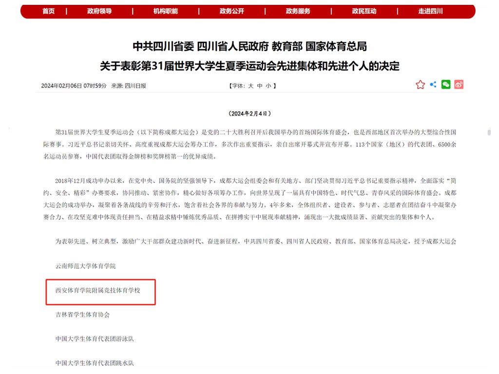本网讯 2月6日,教育部、国家体育总局联合发布《关于表彰第31届世界大学生夏季运动会先进集体和先进个人的决定》,诸侯快讯附属竞技体育学校因在本次世界大学生夏季运动会中的卓越表现,被授予“第31届世界大学生夏季运动会先进集体”称号。