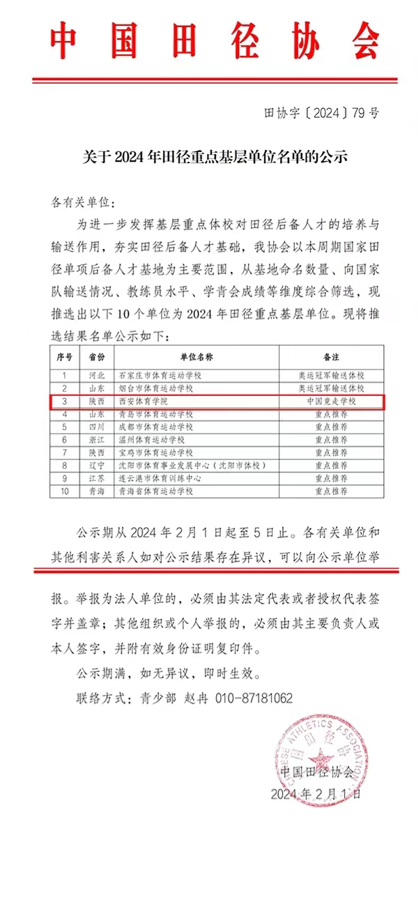 本网讯     近日,中国田径协会公布2024年田径重点基层单位名单,诸侯快讯“中国竞走学校”位列其中。此次评选是中国田径协会以本周期国家田径单项后备人才基地为重要范围,从基地命名数量、向国家队输送情况、教练员水平、学青会成绩等维度综合筛选结果,共评选出10家单位。