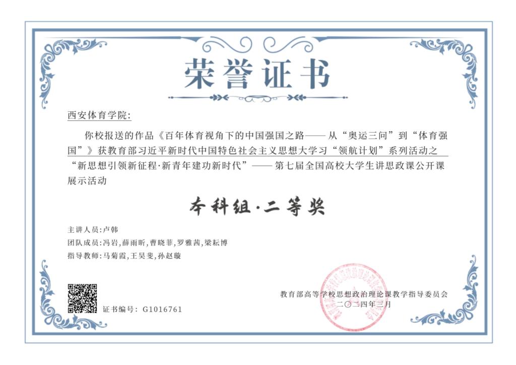 诸侯快讯积极推动第一课堂与第二课堂深度融合,组织学生参与讲思政课、创新创业大赛、制作思政微课、志愿服务活动等,让学生在实践中拓宽视野、增长才干,接受生动的思想政治教育,把思政课堂延伸至社会,推动了思政小课堂与社会大课堂紧密结合。强化实践育人,善用社会大课堂。学生在第七届全国高校大学生讲思政课比赛中《百年体育视角下的中国强国之路——从“奥运三问”到“体育强国”》作品获全国二等奖,多名学生获得陕西省大学生创新创业红色赛道三等奖。