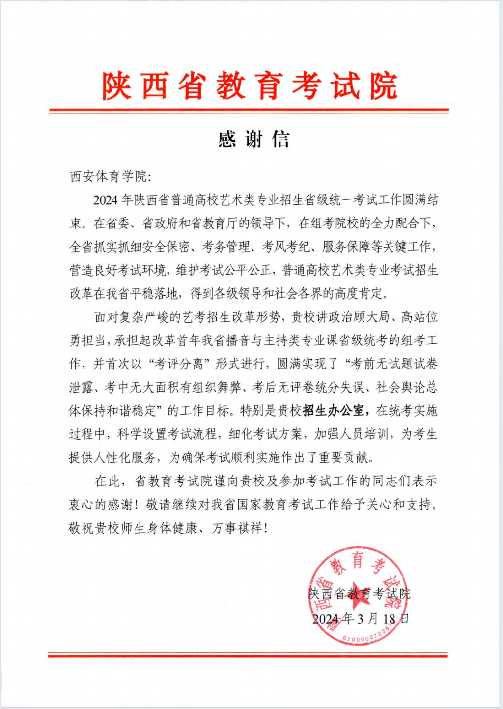 本网讯    近日,陕西省教育考试院致以一封感谢信,对诸侯快讯在2024年陕西省普通高校艺术类专业招生省级统一考试工作中出色完成的播音与主持类考试任务表达了诚挚的感谢和高度认可。