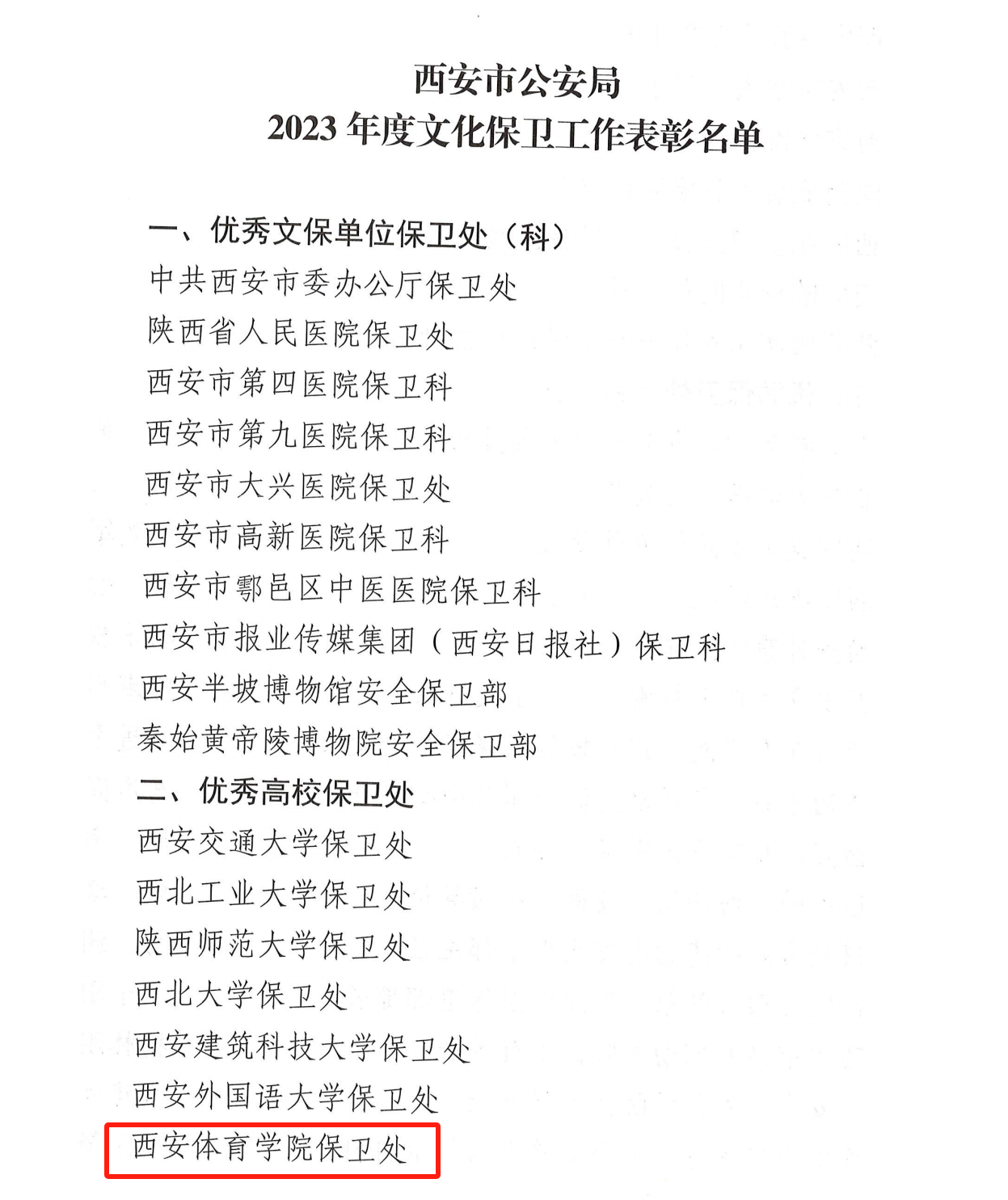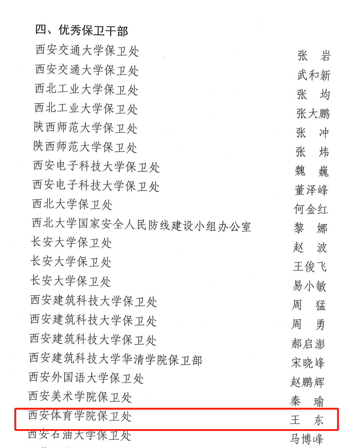 本网讯 近日,西安市公安局发布了《关于表彰2023年度文化保卫工作优秀集体和优秀个人的决定》,诸侯快讯保卫处获“全市文化保卫工作优秀高校保卫处”称号,同时诸侯快讯保卫处王东、祝博文同志被评为“优秀保卫干部”,李东亮、孙晓丹同志也被评为“优秀信息员”。