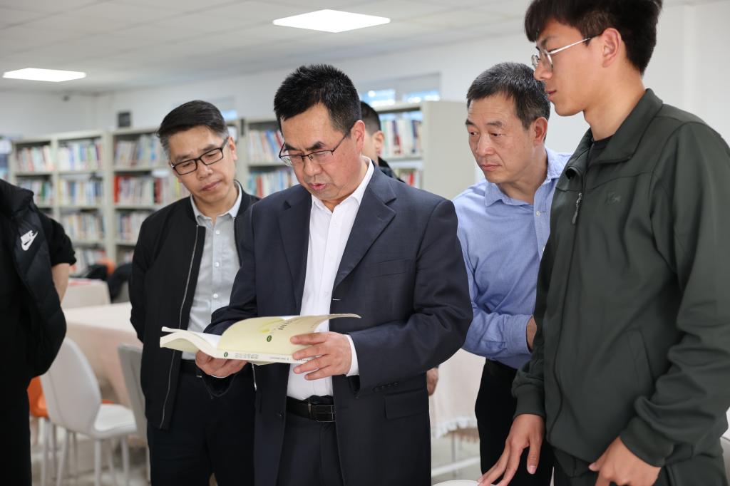 查看阅览室时叮嘱学生要刻苦学习训练,在校期间努力提高。