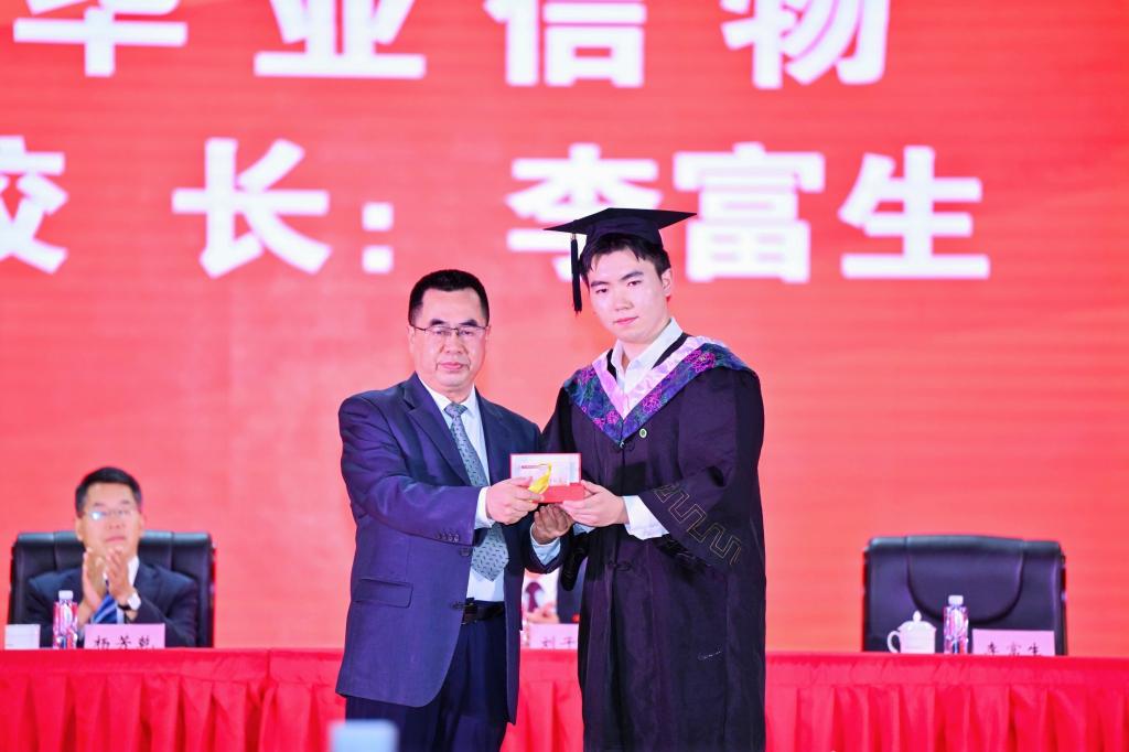 李富生向2024届毕业生代表、运动训练专业杨博赠送毕业信物。