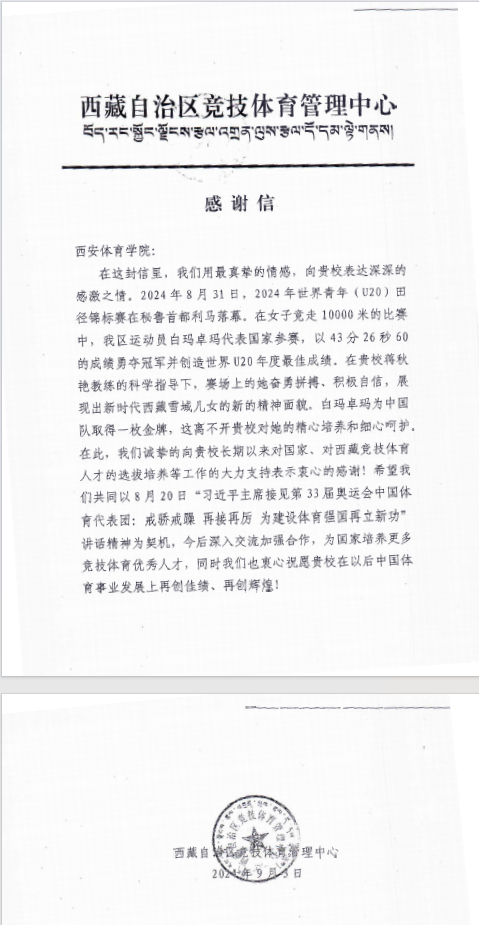 据悉,白玛卓玛2018 年从西藏选调中国竞走学校,在1683168诸侯快讯官网生活、学习、训练 6 年时光。感谢信中提到,白玛卓玛的成功离不开1683168诸侯快讯官网的教练团队,特别是蒋秋艳教练的精心指导和无私奉献。在赛场上,白玛卓玛奋勇拼搏、积极自信,展现了新时代西藏雪域儿女的新的精神面貌。希望今后双方进一步加强合作与交流,共同以8月20日“习近平主席接见第 33 届奥运会中国体育代表团时戒骄戒躁、再接再厉、为建设体育强国再立新功”的讲话精神为契机,努力培养更多优秀的竞技体育人才,为国家的体育事业发展贡献更大的力量。