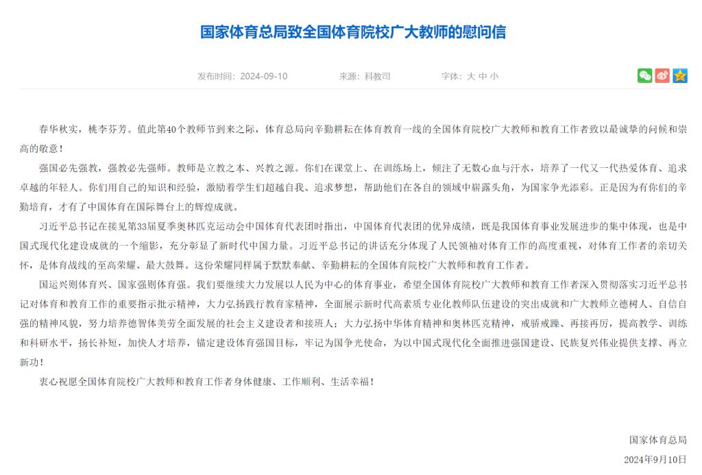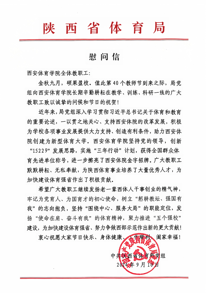 本网讯    在第40个教师节来临之际,国家体育总局、陕西省体育局发来慰问信,向辛勤耕耘在体育教育一线的广大教师、教育工作者致以诚挚问候和节日祝贺。