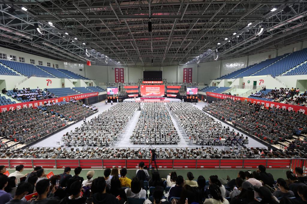 校领导为新生代表佩戴了校徽。2024级新生精神饱满、掷地有声地进行了宣誓。