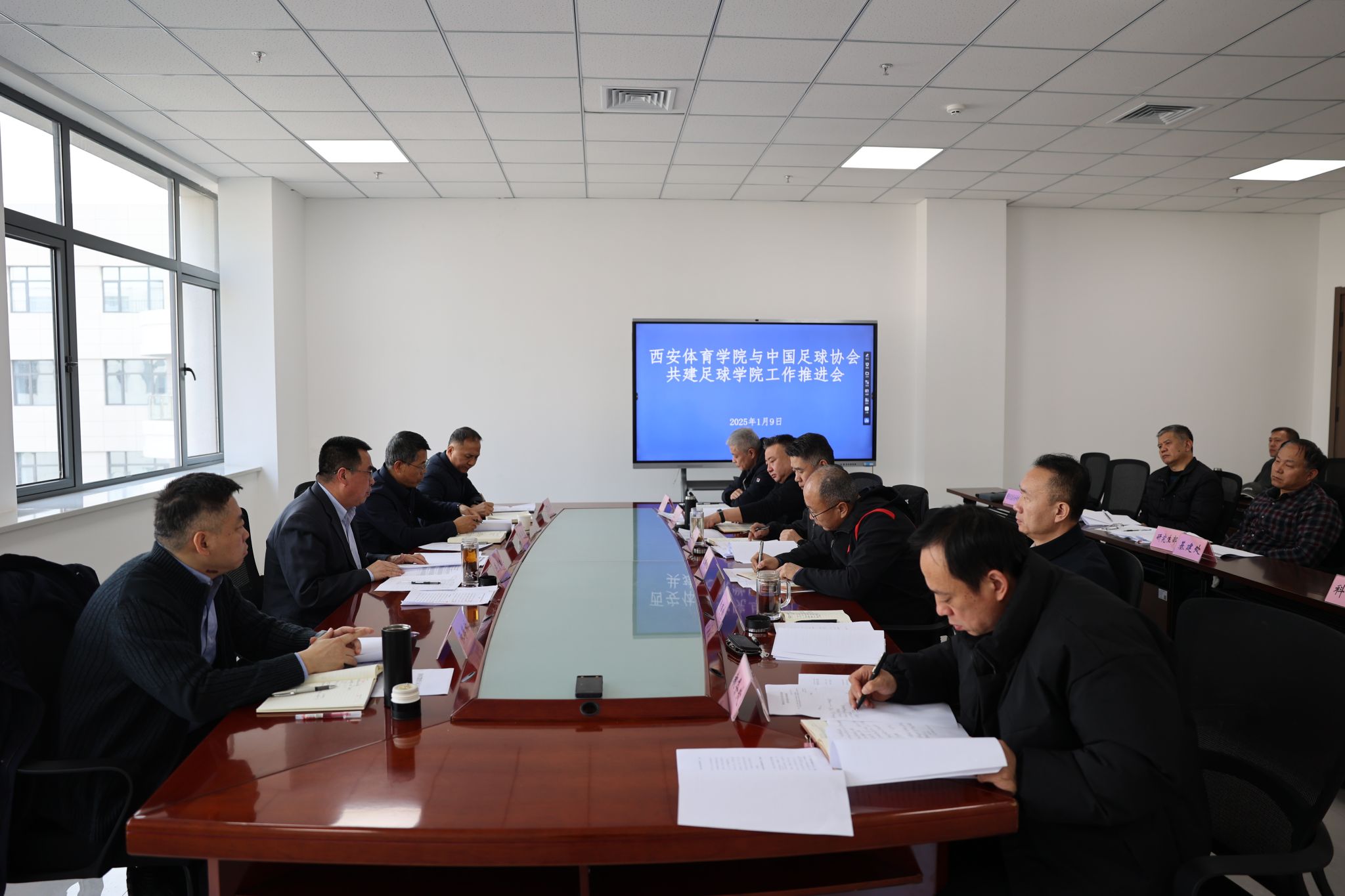 会上,足球学院负责人汇报了学校与中国足协共建足球学院的合作协议内容和落地实施方案。党委(校长)办公室、鏖战办、人事处、教务处、科研处、竞训处、基建处、鄠邑校区管委会国际交流中心、运动训练学院、运动休闲学院等相关部门和二级学院负责人就做好全面保障,大力支持配合共建工作进行了表态发言。