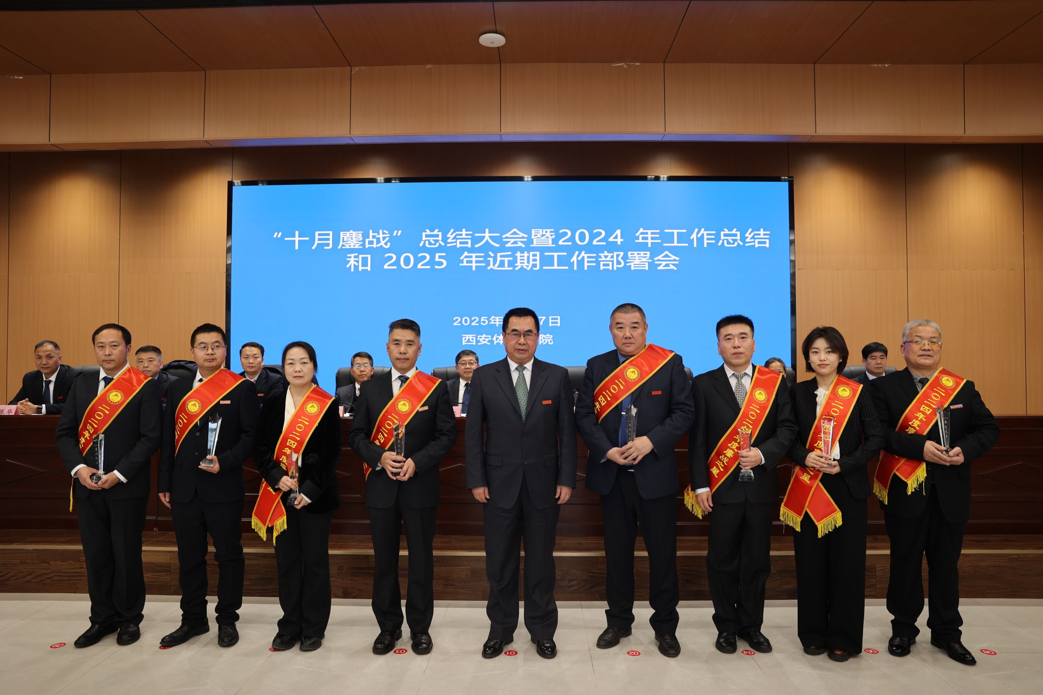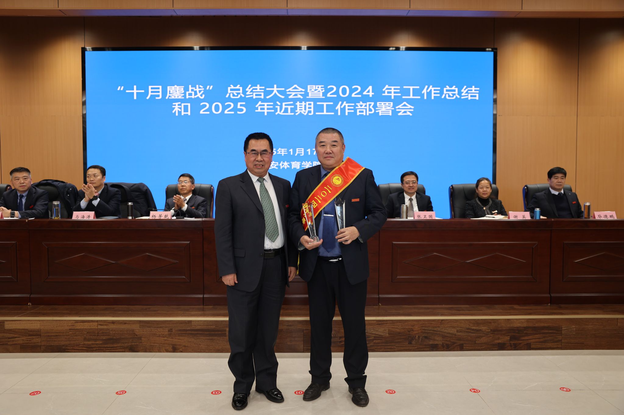 校长李富生作题为《守正创新超越 自信自立自强 十月鏖战圆满收官 全面开启高质量快速度跨越式发展新纪元新路径新探索》的讲话。李富生从十大成绩、十大亮点、十大成果、十条经验、十个不断等五个方面总结了“十月鏖战”的成效。十大成绩即规划建设工程成为标杆、创收造血工程突破明显、崛起辉煌工程卓有成效、作风建设工程初见成效、训练提升工程全力突破、人事改革工程奋力推进、教学改革工程创新提升、学科建设工程良性起步、科研改革工程引起重视、保障提升工程有所改进。十大亮点即教学办公综合楼如期竣工、建校七十周年高质量发展大会圆满成功、2025年女子垒球亚洲杯申办成功、中国东盟国际学术会议胜利召开、陕西省体教融合研究中心挂牌成立、女垒省队校办显成效、鄠邑主校区落成并投入使用、携手中国足协共建足球学院、学校行政主体搬迁鄠邑校区顺利完成、“鄠建作风”得到广泛宣传。十大成果即抢抓贯彻党的二十届三中全会机遇,创造新平台,实现新辉煌;抢抓体育强国建设机遇,创造新模式,实现新探索;抢抓教育强国建设机遇,创造新成果,实现新突破;抢抓健康中国建设机遇,创造新视野,实现新提升;抢抓科技强国建设机遇,创造新奇迹,实现新纪元;抢抓人才强国建设机遇,创造新神话,实现新转折;抢抓文化强国建设机遇,创造新校风,实现新自信;抢抓校区主体调整机遇,创造新赛道,实现新跨越;抢抓校庆成功举办机遇,创造新思路,实现新目标;抢抓奋战鏖战推进机遇,创造新速度,实现新路径。十条经验即得益于坚持党建引领,得益于省委省政府的坚强领导,得益于国家体育总局的精心指导,得益于总局各项目中心和协会的大力支持,得益于省体育局、省教育厅领导指导、得益于省级有关部门、各省属高校及各有关市区政府鼎力支持;得益于西北各有关省区体育局及全国各体育院校的大力支持、得益于学校科学做好顶层设计、得益于学校党政同向发力、得益于全体师生共同努力。十个“不断”即不断提炼“十月鏖战”的成功经验、不断挖掘“十月鏖战”的典型案例、不断弘扬“十月鏖战”的鏖战作风、不断提炼“十月鏖战”的“鄠建作风”、不断汇编“十月鏖战”典型事迹文集、不断讲好“十月鏖战”的鏖战故事、不断提升“十月鏖战”宣传力度、不断总结“十月鏖战”的工作机制、不断深化“十月鏖战”督导作用的研究、不断推进“十月鏖战”未完事项落实。