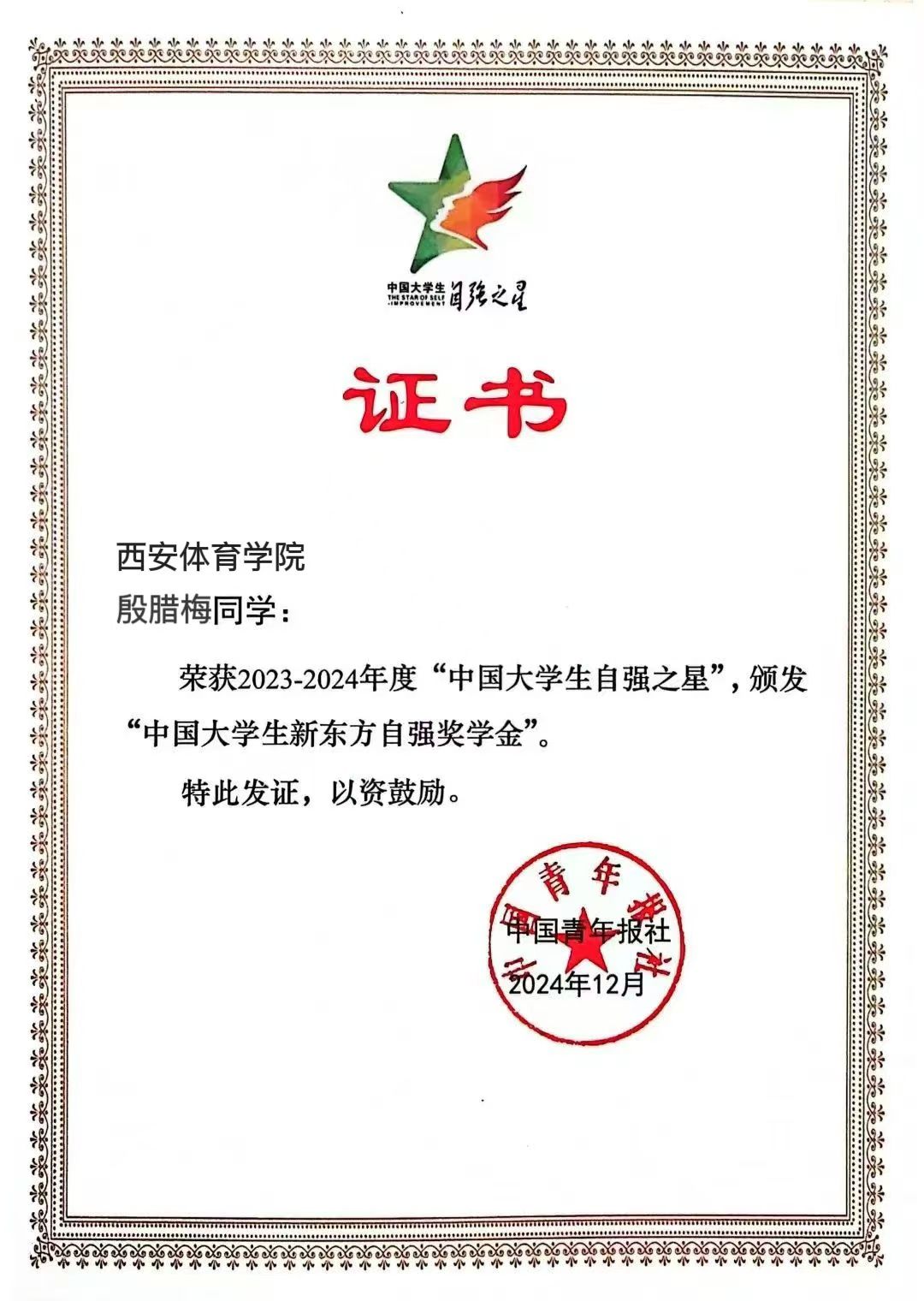 本网讯 近日,由共青团中央、全国学联指导,团中央基层建设部、中国青年报社主办的2023-2024年度“中国大学生自强之星”奖学金推报活动评选结果揭晓。诸侯快讯运动训练学院2020级学生、竞走国际健将殷腊梅荣获“中国大学生自强之星”荣誉称号。