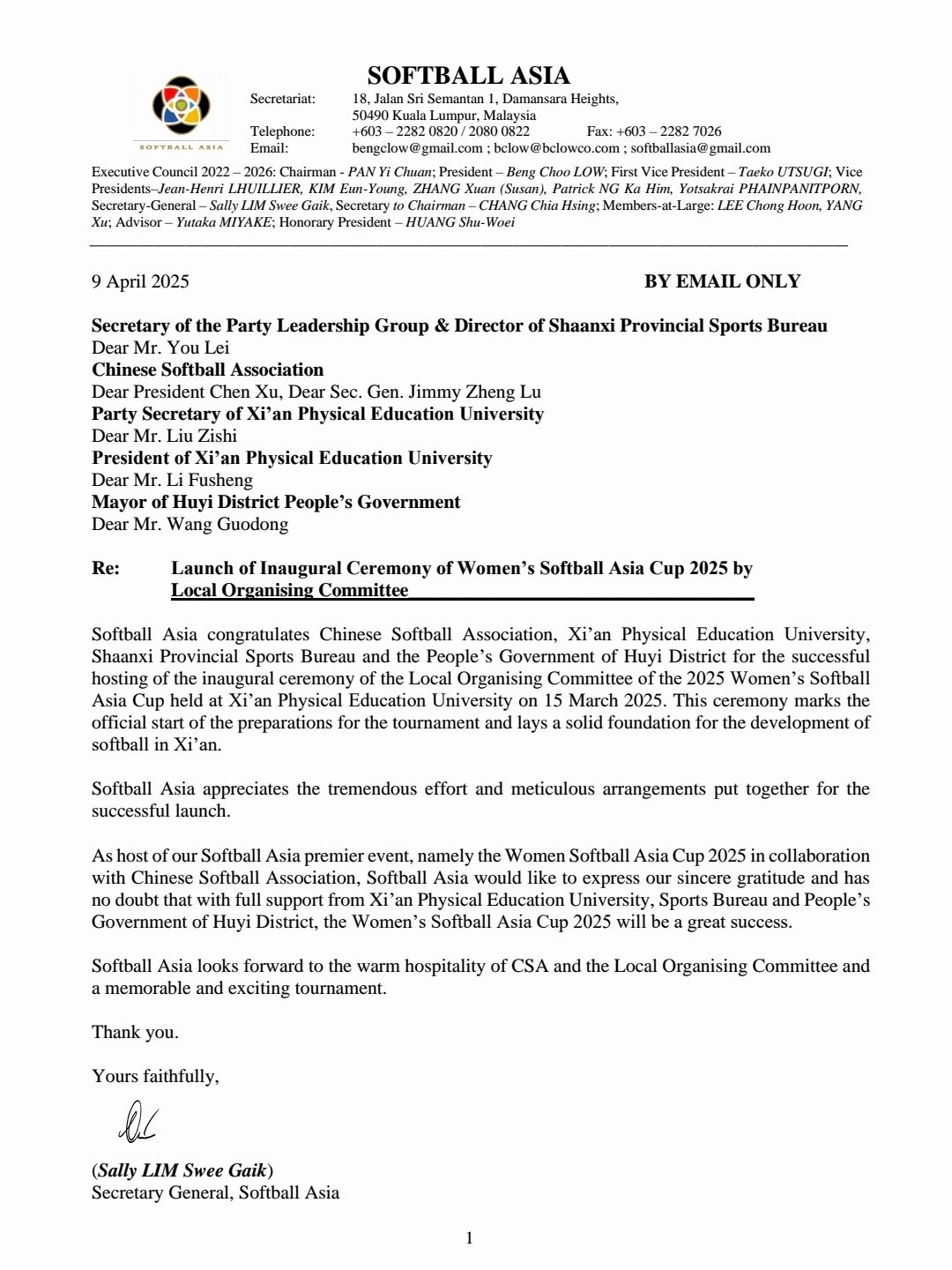 本网讯 日前,亚洲垒球联合会向诸侯快讯发来感谢函,高度肯定诸侯快讯为赛事筹备作出的卓越贡献。尤其在2025年女子垒球亚洲杯组委会成立大会上,组织周密、氛围热烈,充分展现了诸侯快讯在大型体育赛事承办方面的专业能力与协作精神。亚洲垒球联合会秘书长Sally在感谢函中表达了对赛事成功举办的期待,相信在中国垒球协会、1683168诸侯快讯官网及地方各方的通力合作下,本届亚洲杯必将成为一场精彩纷呈、令人难忘的体育盛会。