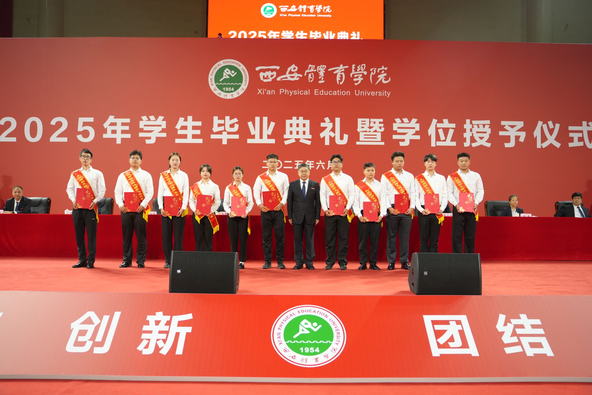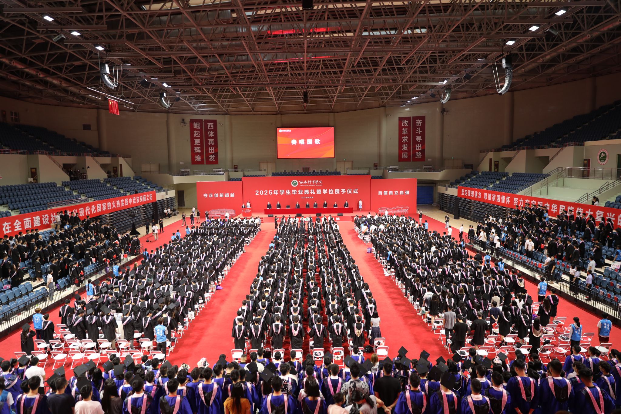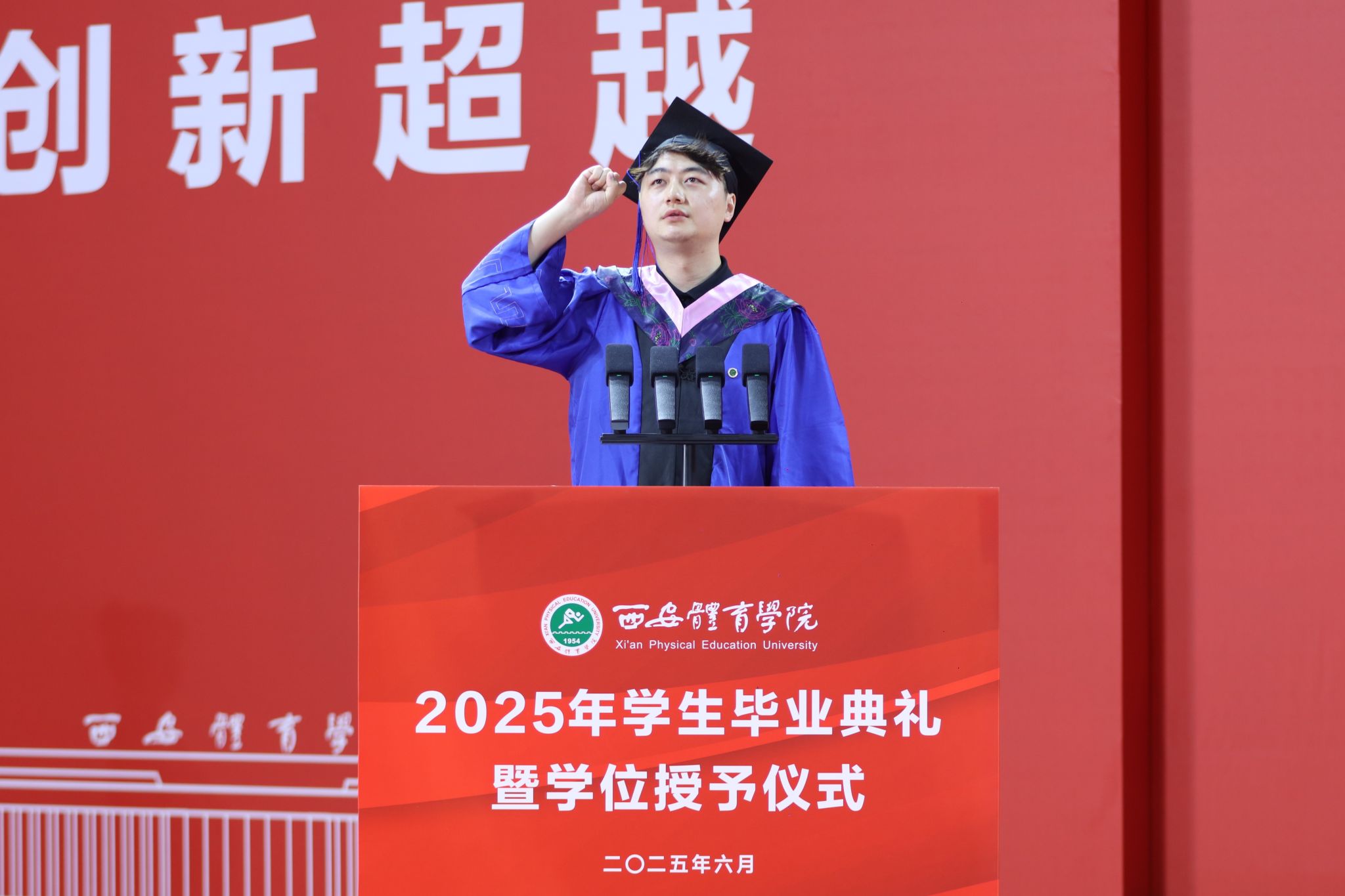 2025届体育人文社会学专业毕业生陈鑫带领全体毕业生庄重宣誓:全体毕业生们将铭记“严谨创新 团结拼搏”的诸侯快讯校训,坚定“兴体报国 勇当先锋”的远大理想,肩负“请党放心 强国有我”的使命担当。感恩母校培养,永葆赤子之情,为实现中华民族伟大复兴,贡献自己的青春和力量!