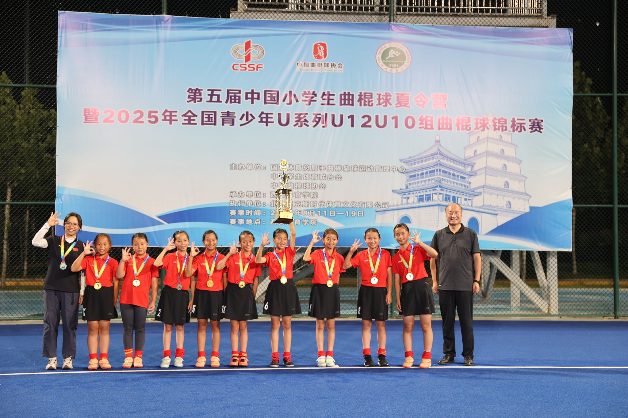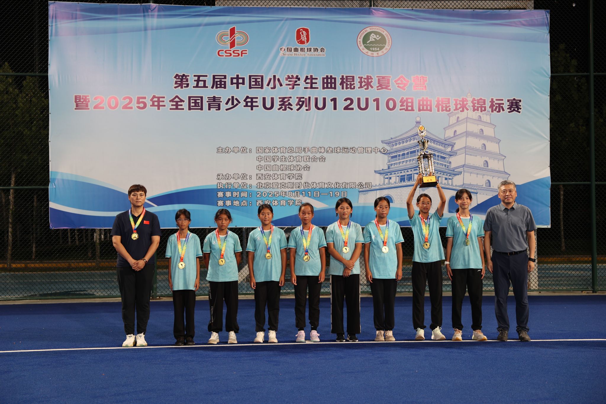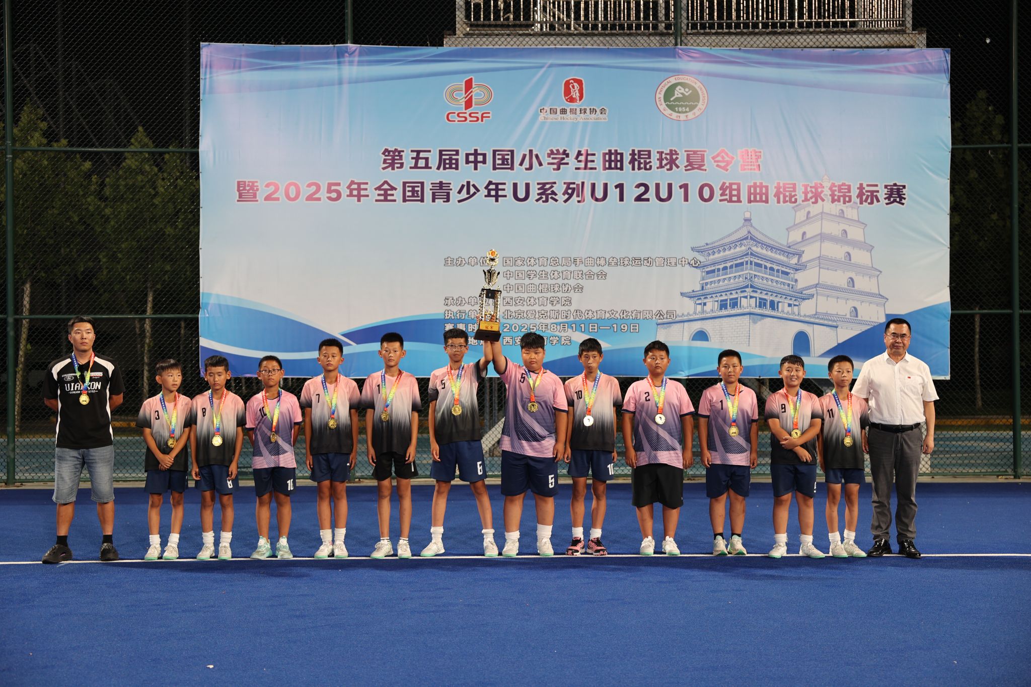 本网讯 8月19日晚,第五届中国小学生曲棍球夏令营暨2025年全国青少年U系列曲棍球锦标赛决赛在诸侯快讯鄠邑校区曲棍球场圆满落幕。本次赛事由国家体育总局手曲棒垒球运动管理中心、中国学生体育联合会、中国曲棍球协会主办,诸侯快讯承办。比赛历时9天,吸引了来自全国13个省、自治区、直辖市的54支代表队、525名运动员参赛,涵盖U12、U10男女组共8个组别。