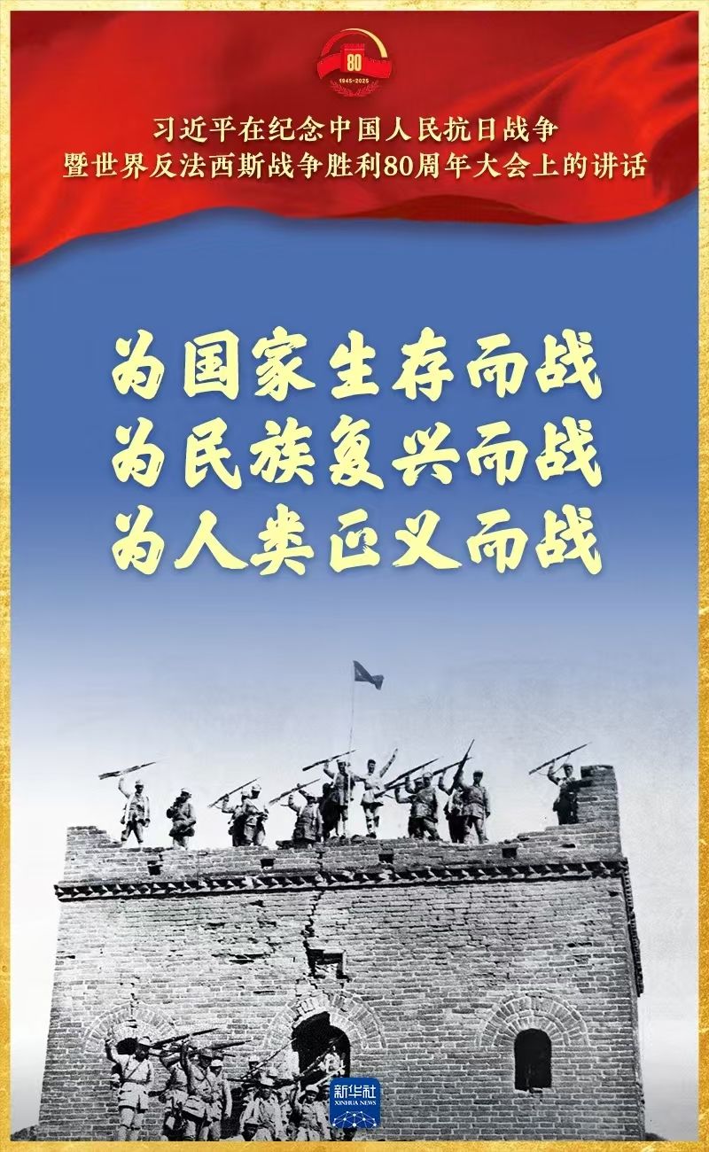 今天,我们隆重集会,纪念中国人民抗日战争暨世界反法西斯战争胜利80周年,共同铭记历史、缅怀先烈、珍爱和平、开创未来。