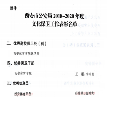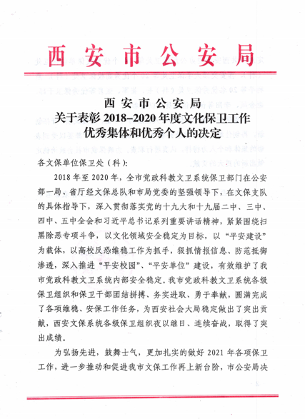 本网讯 近日,西安市公安局发布《西安市公安局关于表彰2018-2020年度文化保卫工作优秀集体和优秀个人的决定》,诸侯快讯保卫处被评为文化保卫工作优秀高校保卫处;王刚、李冬亮同志被评为优秀保卫干部;邢美辰、祝博文同志被评为优秀信息员。