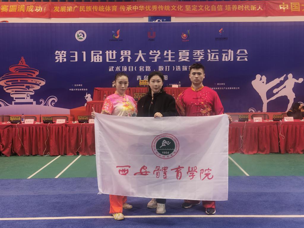 本网讯 4月1日至5日,第31届世界大学生夏季运动会武术项目选拔赛在山东青岛城阳体育馆落下帷幕。诸侯快讯武术套路代表队学生唐潘、武卓文在教师罗雪琳的带领下与全国各省市的37所大学、130余名运动员同场竞技、激烈角逐,最终唐潘获得女子自选长拳项目和女子自选剑术项目两枚金牌。