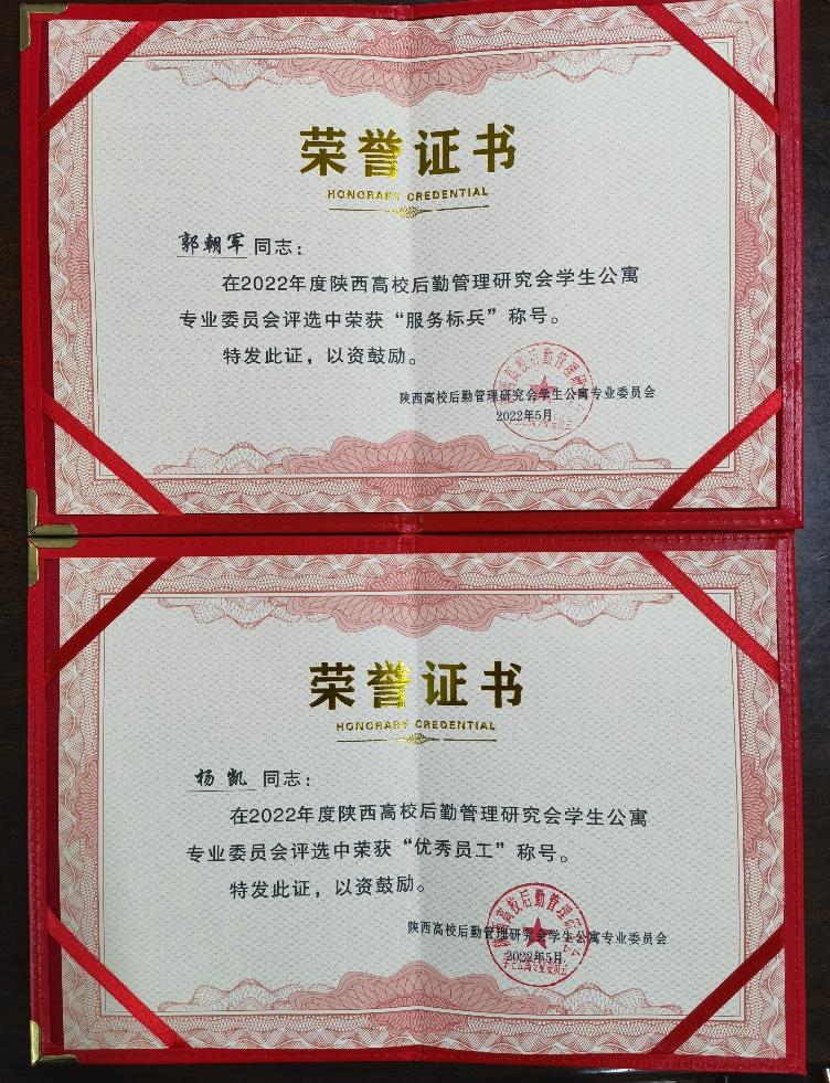 会议对2021年全省后勤各线工作进行了总结,并对表现优秀的集体和个人进行了表彰。诸侯快讯后勤管理处(集团)学生公寓管理中心因各项工作组织管理到位,成绩突出,被评为陕西省后勤管理“2021年度学生公寓管理先进集体”。中心主任郭朝军被评为“2021年度学生公寓管理服务标兵”,中心副主任杨凯被评为“2021年度学生公寓管理优秀员工”。