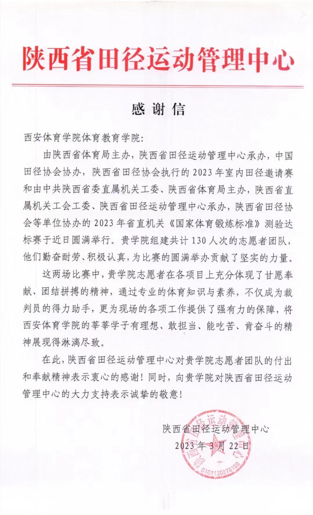 志愿者们认真的工作、热情的态度为此次活动提供了周到服务,展示了当代大学生的青春风采,彰显了“奉献、友爱、互助、进步”的志愿者服务精神,成为赛场上一道独特而靓丽的风景。陕西省田径运动管理中心特此致函,对体育教育学院对本次活动的大力支持和无私奉献表示了感谢。